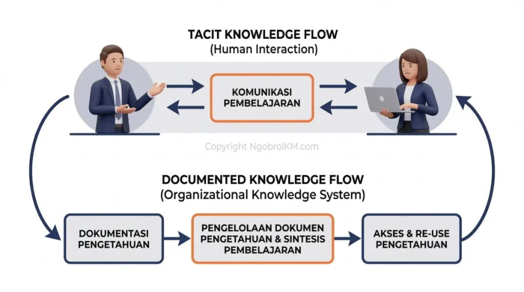 Namun dipraktiknya, tidak semua pengetahuan bisa disebarkan melalui percakapan atau komunikasi langsung. Sebagian pengetahuan perlu ditangkap dan didokumentasikan agar dapat digunakan kembali oleh orang lain di masa depan.