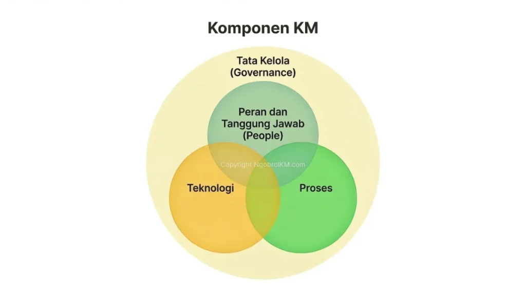 Empat komponen yang paling sering digunakan dalam praktik KM adalah people, process, technology, dan governance.