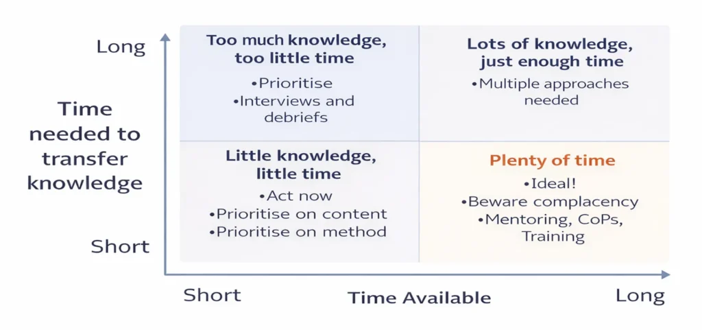 Knowledge retention sering menjadi langkah awal dalam strategi Knowledge Management. Dengan memahami hubungan antara waktu yang tersedia dan lamanya transfer pengetahuan, organisasi dapat menentukan pendekatan KM yang paling realistis dan berdampak.